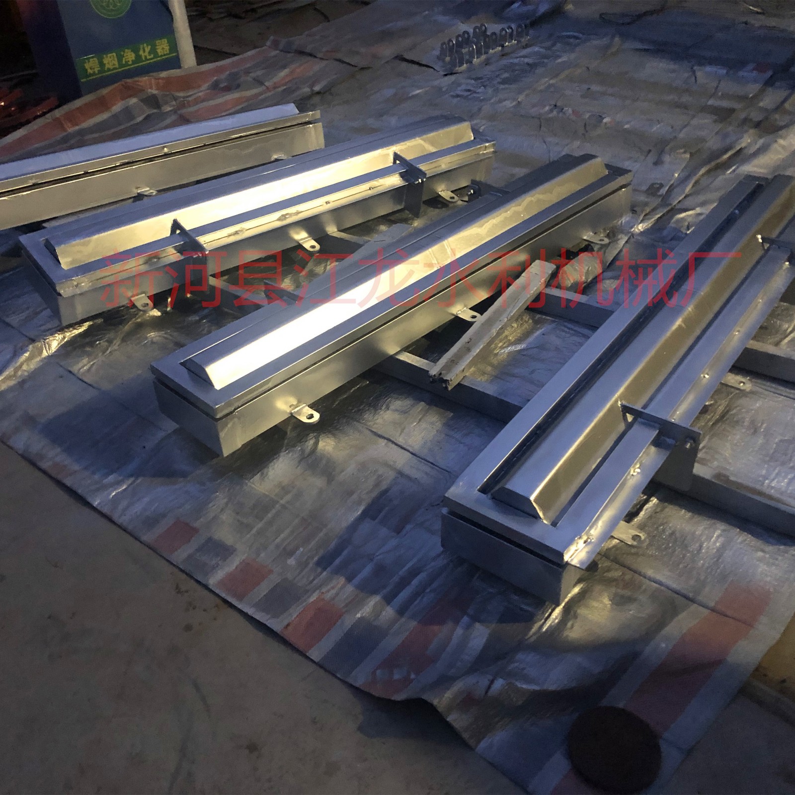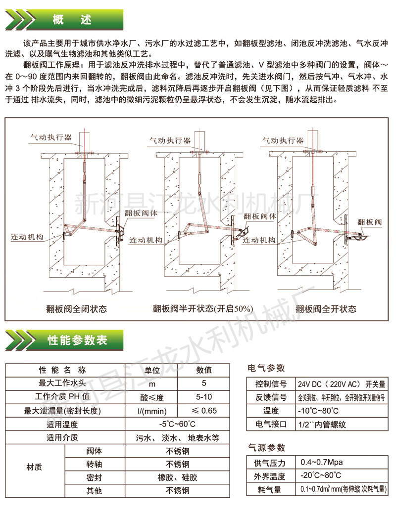 阀门由气缸带动传动轴驱动阀板,动作时阀板及橡胶绕底部转轴作0~90°旋转运动,以能够控制水位。