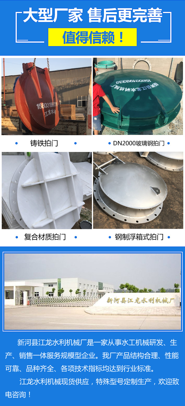 材质分为不锈钢、铸铁、型钢、复合材料(玻璃钢)等多种材料。而拍门又分为很多种,比如,浮箱式拍门,平板式拍门,套筒式拍门等等