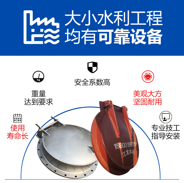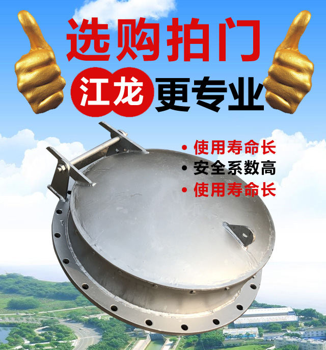 拍门主要由:阀座、阀板、密土封圈、铰链四部分构成。性状分为圆形和方形。拍门的材质传统上为各种金属制品,现在已经发展为多种复合材料。产品属性当前随着新材料科技的发展,有了复合材料拍门,如玻璃钢、高密度聚乙烯等。复合材料拍门将是将来拍门的发展方向,复合材料拍门本身利用了新材料科技的可塑造特点,强度高,密度小,正是传统拍门材料的弊端。新材质的拍门重量轻,开启迅速,水头损失小,其价格也具有优势,而且一般无回收价值而使防盗性能好。功能用途由阀座(阀体)、阀板、密封圈、铰链四部分构成。仅用于单向水流的圆形和方形出水口,结构严密,工作可靠,无需人力操作启闭力来自水源压力,当拍门内的水压大于拍门外侧压力则开启工作可靠,无需人力操作启闭力来自水源压力,当拍门内的水压大于拍门外侧压力则开启;反之则关闭。